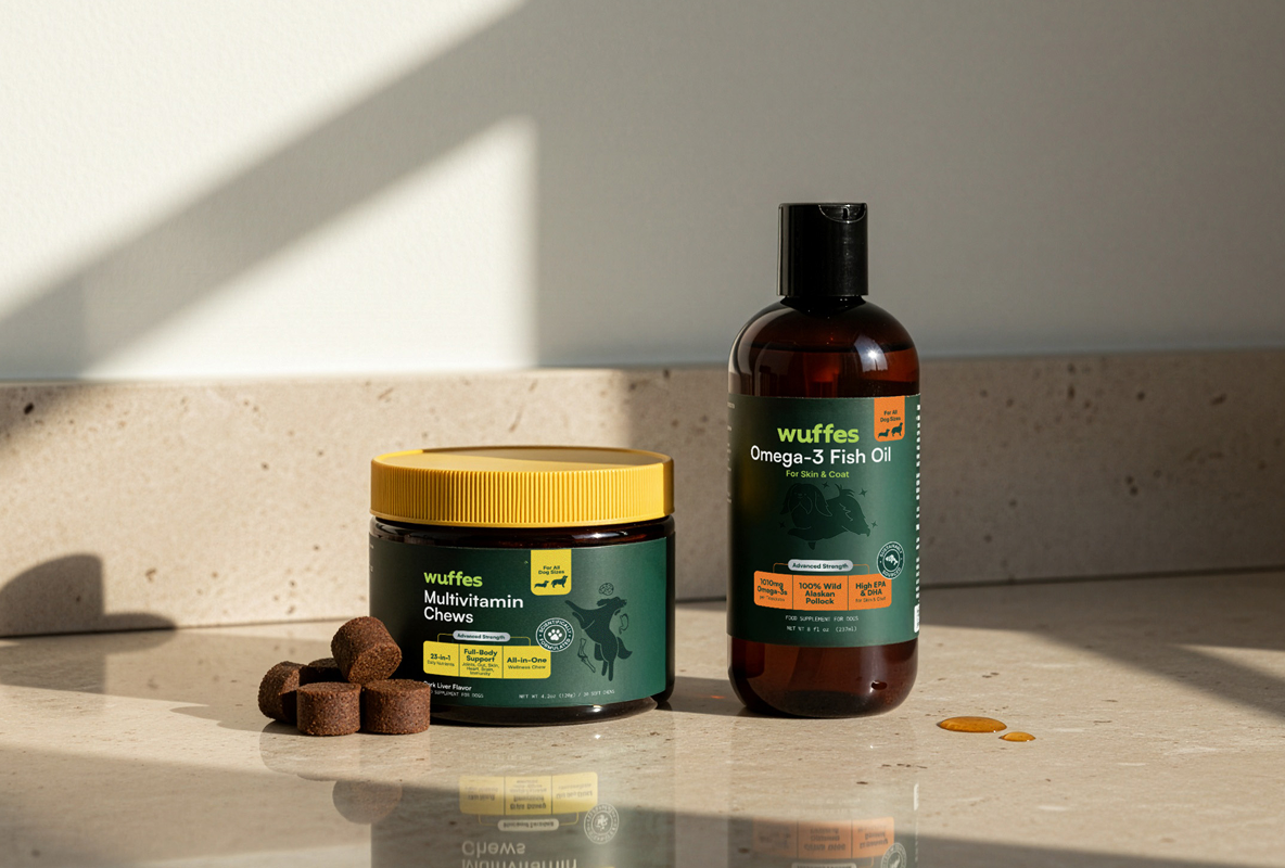 Care for your pup that covers everything from the inside out. Our Multivitamin Chews boosts energy levels, enhances immune function, supports bone and joint health, while our Omega 3 Fish Oil helps add luster and shine to their coat, whilst also maintaining cardiovascular health and provides nutrients for bone and joint health.