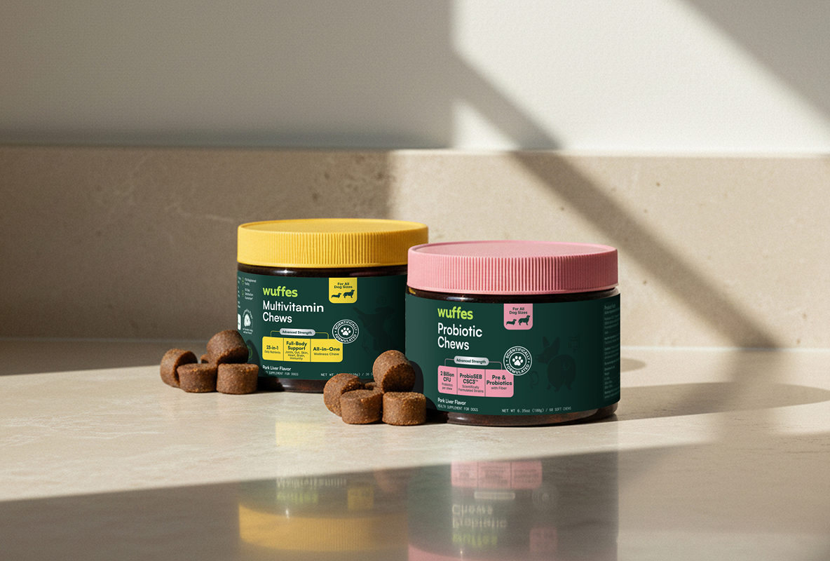 An everyday essentials set to cover all bases of your pup’s wellness routine. Our Multivitamin Chews boosts energy levels, enhances immune function, supports bone and joint health, while our Probiotic Chews supports digestive health, their immune system and aids in the recovery from antibiotics.