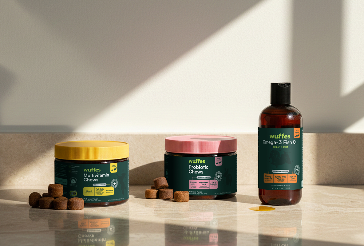 Cover every single base with this triple threat set. Our Multivitamin Chews boosts energy levels, enhances immune function, supports bone and joint health, while our Probiotic Chews supports digestive health, their immune system and aids in the recovery from antibiotics. Our Omega 3 Fish Oil adds luster and shine to coats, maintains cardiovascular health and more.
