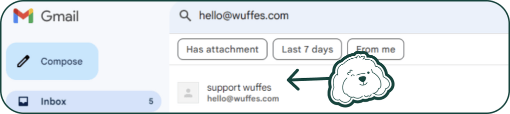 Navigate to the inbox of the email used to make your wuffes purchase. In the search bar, type hello@wuffes.com and hit enter